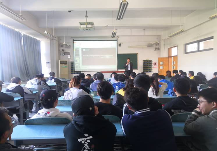 会议结束后,John Tan教授一行在二教303为机械设计制造及其自动化中外合作办学本科教育项目大三的员工做了项目宣讲,介绍了诺森比亚大学的教学环境、教学条件、课程设置及留学申请过程中的注意事项,为项目员工出国留学做准备。