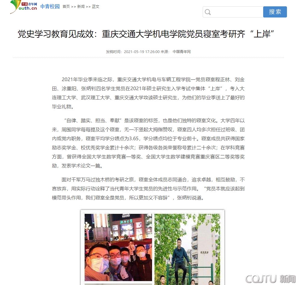 2021年毕业季来临之际,beats365一党员寝室程正林、刘金田、涂重阳、张炳钊四名员工党员在2021年硕士研究生入学考试中集体“上岸”,考入大连理工大学、武汉理工大学、beats365官方网站攻读硕士研究生,为他们的毕业季送上了最好的毕业礼物。