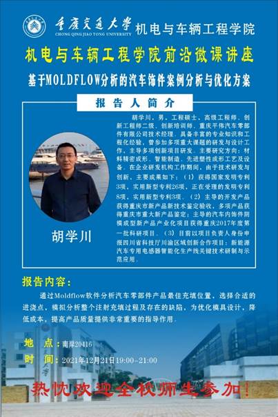 beats365于2021年12月21日邀请重庆平伟集团胡学川高级工程师做了“基于MOLDFLOW分析的汽车饰件案例分析与优化方案”前沿微课专题讲座。本次讲座采用线下讲座的方式,共计有近40余名本科生、10余名硕士生及部分青年教师参加。