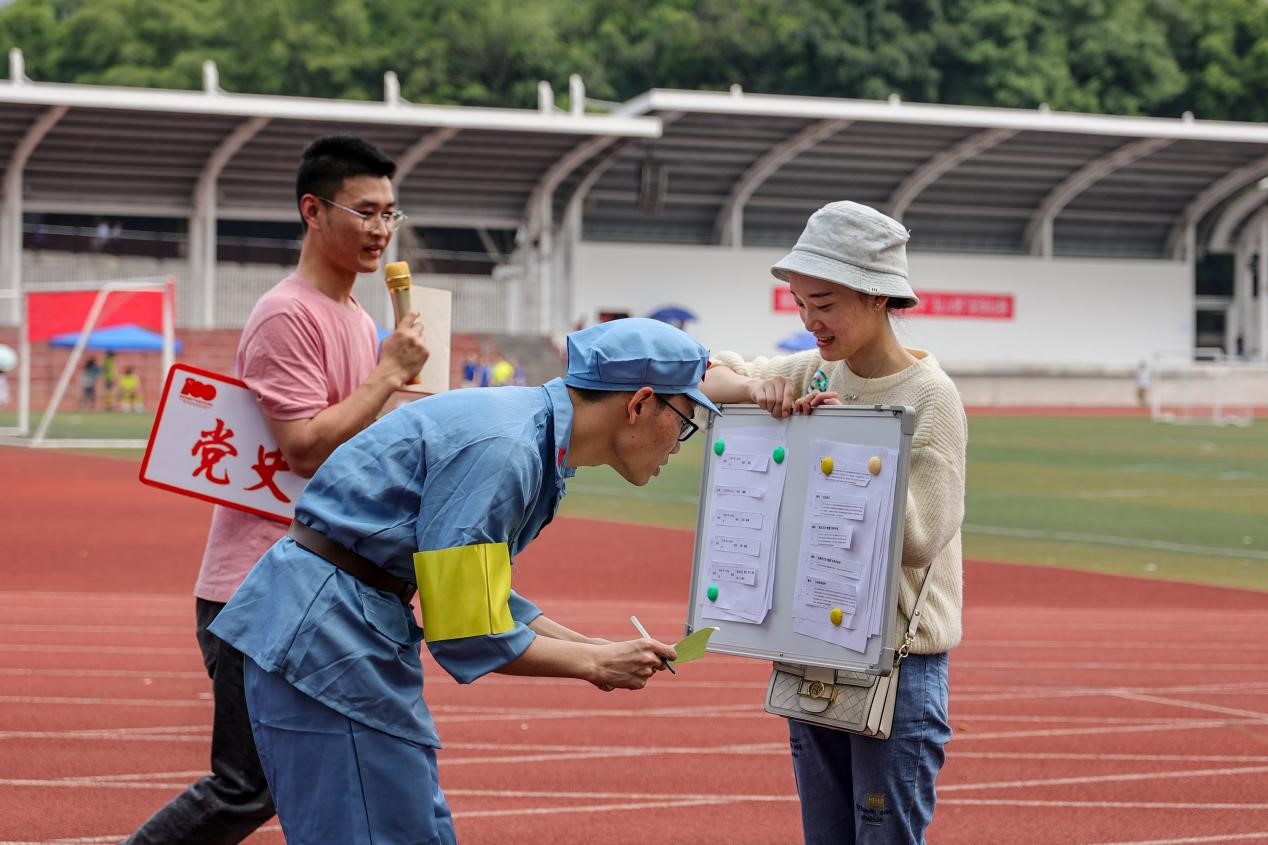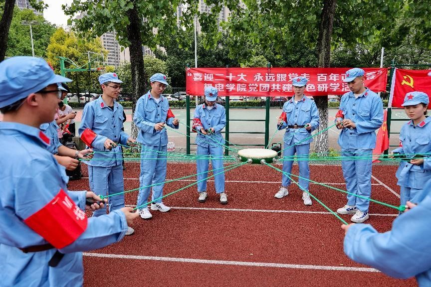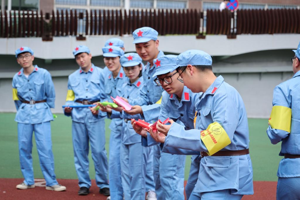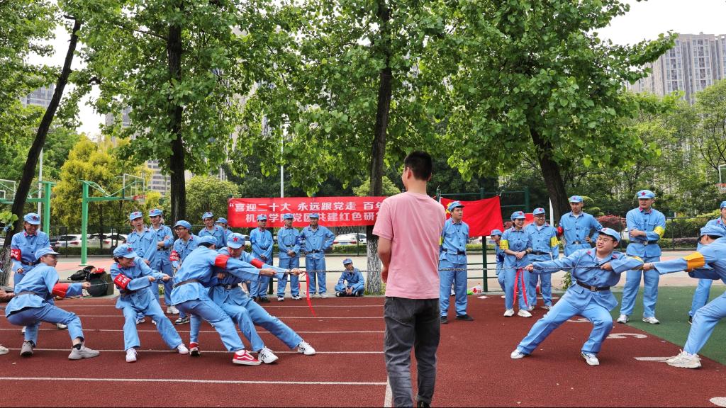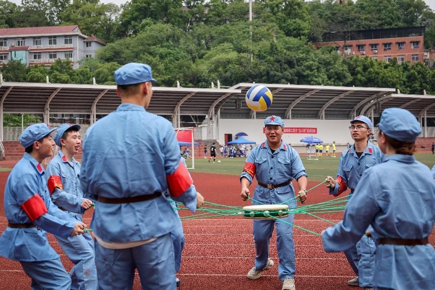“党员一条心”活动,小组合作用轨道将小球送到终点,既要讲究速度又要保证小球不会掉落,是对小组的配合默契度的考验;“百团大战”活动,小组成员同时用绳子拉住悬空的战鼓,想要将小球颠起来,这个极富高难度的团队游戏,是对小组的配合默契度的又一次考验;“生死拉锯战”活动是小组之间的拔河比赛,回望八十年前那段苦难和辉煌,拔河体育活动成为红军缓解压力和保持体魄、保持作战状态的重要方式之一。“唱出对党的爱”活动,每小组唱一首红歌,体现同学们歌盛世、颂党恩的情感和坚决跟党走的决心。