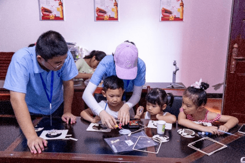 活动伊始,志愿者们首先带领孩子们回顾了党的百年风雨岁月,随后,向小朋友介绍了红色手工作品制作方式和注意事项,并展示作品完成后的图片。接着,在志愿者的引领下,小朋友们掌握了制作小窍门,充分发挥自己的想象力和动手能力,采用艺术形式讴歌党的丰功伟绩,赞美祖国大好河山,勾画图案、组装作品,创作出形态各异、惟妙惟肖的红色作品。