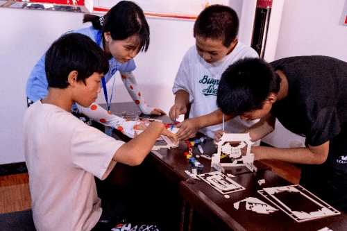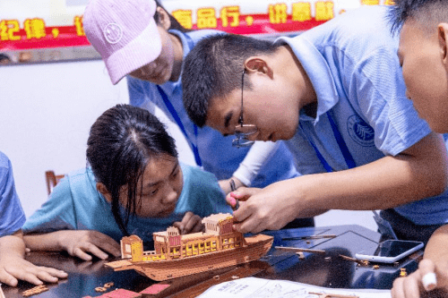 在组装红船作品的过程中,志愿者们先和大家讲述了红船的历史和“红船精神”的深刻内涵,随后指导孩子们一步步耐心地拼装。大家发挥智慧,使用巧劲,跟着志愿者们制作得不亦乐乎。尽管这次手工对有些小朋友来说有点难度,但是大家相互帮助、不言放弃,齐心协力完成了红船制作。此次红船模型制作,孩子们用稚嫩的双手拼出艘艘红船,让红色印记深深映入小朋友心中,让党的光辉历史和奋斗足迹,成为少年儿童向上的榜样。随着红色作品相继制作完成,让孩子们成就感满满,对爱国爱党有了新的认知,小朋友们并纷纷骄傲地把自己团队的作品展现在镜头之下与志愿者们合影。
