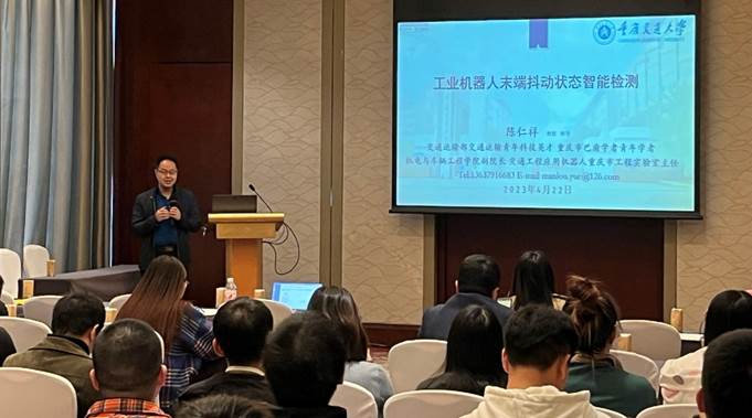 在大会主题报告环节,陈仁祥教授作了题为“工业机器人末端抖动状态智能检测”的报告,从工业机器人末端抖动状态数据采集设计、抖动程度识别、抖动原因识别及检测系统开发等方面作了详尽的介绍,并与参会学者进行了深入交流。