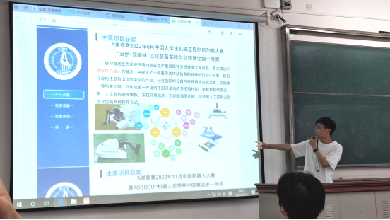 余水鑫曾获得老员工机械工程创新创意大赛全国一等奖、机器人大赛全国一等奖等多项国家级学科竞赛奖项。他从参加学科竞赛如何组队、学科竞赛所需技能、竞赛资料获取方法等方面进行了讲解,并从自身经验出发,分享了在备赛期间所遇到的问题和解决方法,鼓励学弟学妹们勇敢迈出参加竞赛的第一步。