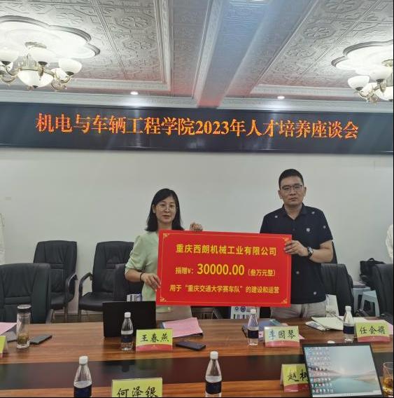 会上,公司代表公司教育发展基金会与重庆西朗机械工业有限公司签署合作协议。重庆西朗机械工业有限公司成立于2014年,在全球15个国家拥有数万家合作零售店,是中国摩托车售后零件出口头部企业。本次重庆西朗公司受邀参加公司人才培养座谈会,赞助公司学科竞赛经费3万元,用于方程式赛车的建设和运营。重庆西朗公司财务总监王春燕女士表示,企业大力支持公司人才培养工作,希望今后在就业、产学研等领域继续加深与公司的交流和合作。