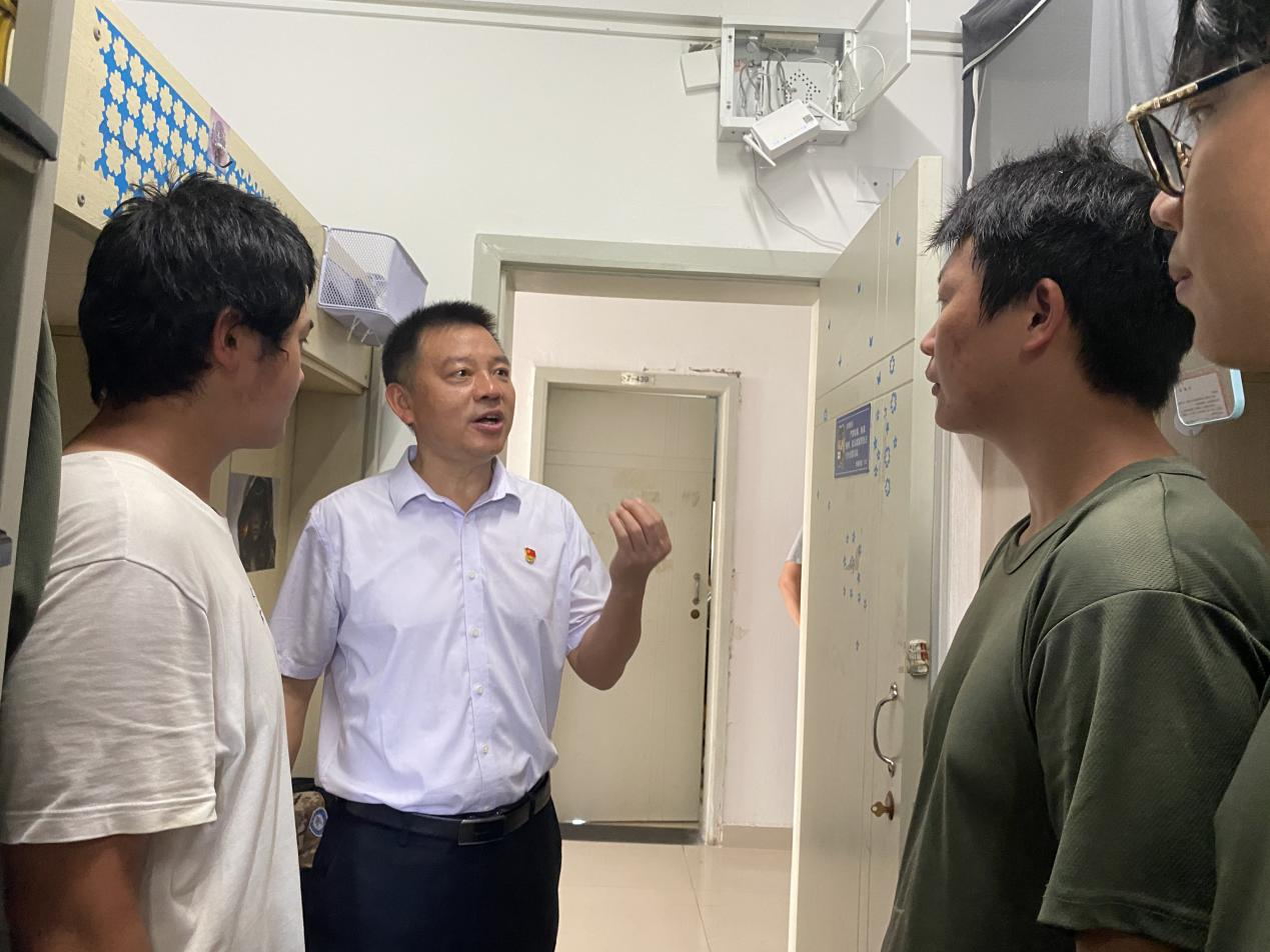 慰问物品发放完毕后,公司领导来到2022级员工宿舍,与同学们进行深入交流,全面了解军训期间同学们的生活状态。走进宿舍,陈作明一行人亲切地与同学们交流,与大家拉起家常,询问同学们这学期的学习情况和军训期间的生活情况,提醒同学们要注意温度变化,做好防暑工作,现场气氛其乐融融。