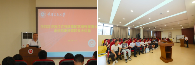 下午,浙江红五环集团董事长苏勇强应邀在第二教学楼七楼教师发展中心报告厅举行职业大讲堂活动,为2025届员工围绕就业形势、行业态势、企业需求和就业技能提升作报告。公司党委副书记林兴冬、副经理何泽银及2025届本科生聆听报告。