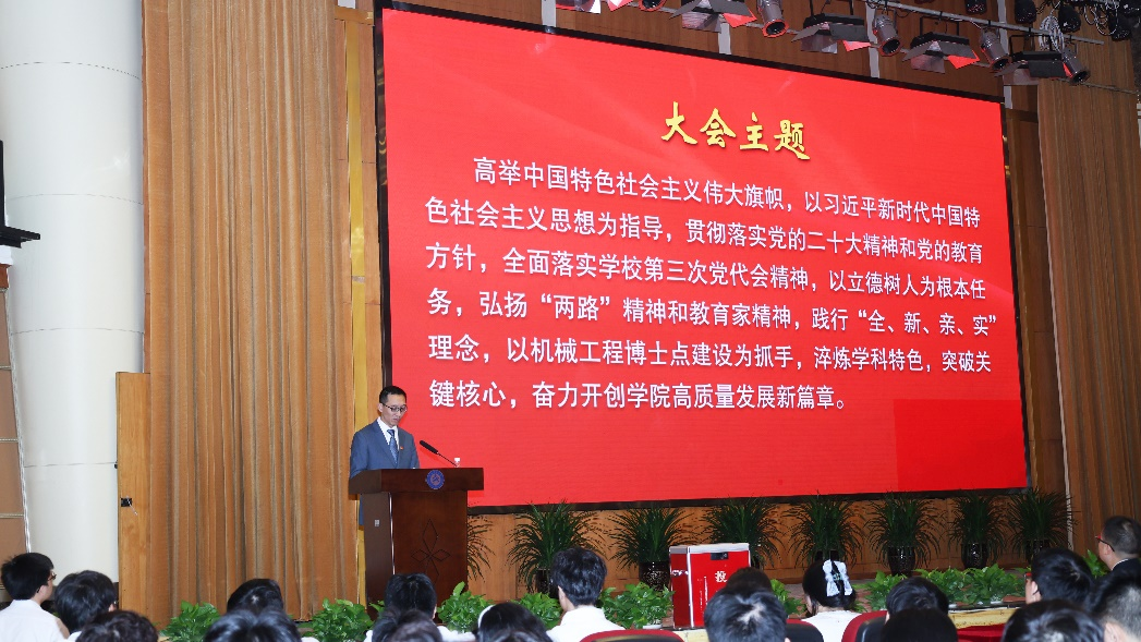 大会的主题是:高举中国特色社会主义伟大旗帜,以习近平新时代中国特色社会主义思想为指导,贯彻落实党的二十大精神和党的教育方针,全面落实公司第三次党代会精神,以立德树人为根本任务,弘扬“两路”精神和教育家精神,践行“全、新、亲、实”理念,以机械工程博士点建设为抓手,淬炼学科特色,突破关键核心,奋力开创公司高质量发展新篇章。
