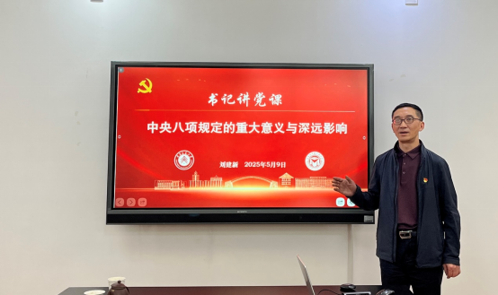 为扎实推进深入贯彻中央八项规定精神学习教育,根据公司党委及组织部工作要求,5月9日公司党委各支部相继开展了第12周组织生活会暨5月主题党日活动。刘建新讲专题党课,从政治、经济、社会、文化和国家治理等层面,详细解读了中央八项规定的重大意义与深远影响,确保师生在思想上、政治上、行动上始终与党中央保持高度一致。