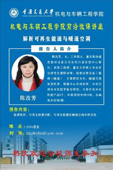 为提高员工对可再生能源与利用前沿技术发展的认识,beats365于2022年6月10日邀请重庆美的通用制冷设备公司陈改芳高工做了“解析可再生能源与暖通空调”专题讲座。