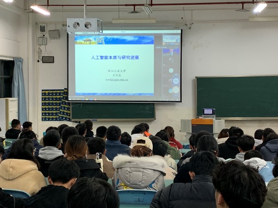 王万良教授为国家教学名师,国家万人计划领军人才,享受国务院政府特殊津贴专家,浙江省杰出教师。本次课程王万良教授围绕人工智能主题,讲解了人工智能方法的本质、人工智能产品的本质和人工智能人才培养三个方面内容。教授介绍了人工智能最开始的哲学起源,1956年的达特茅斯会议的开创性成果以及图灵测试实验等内容,梳理了人工智能发展过程中的重要事件以及经典理论,引发了同学们的广泛兴趣。王万良教授通过医疗、无人驾驶、智能识别、机器人等应用场景和实例生动形象地介绍了人工智能技术的发展现状和产品,极大开拓了同学们对人工智能技术的认识。王万良教授强调,当前的人工智能技术还处于初始阶段,企业、高校对人工智能技术人才求贤若渴,鼓励大家从事人工智能技术相关的研究。