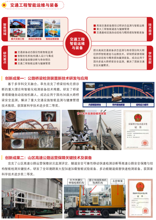 公司以“交通运载装备”和“工程建养智能装备”为载体,形成了“交通装备设计理论与方法”“智能网联新能源汽车”“交通装备先进制造技术”“交通建养智能装备与机器人”4个特色鲜明、优势突出的学科研究方向,服务未来“五式联运并进”交通新场域。