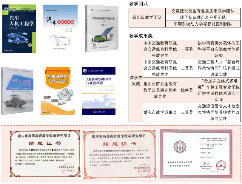 近五年,获中国交通教育研究会、重庆市研究生公司产品改革教学成果奖3项,出版(在编)各类规划教材8部,获各类省部级一流课程10门,获批教育部协同育人项目12项,获批省部级公司产品改革项目(含重点)10项。