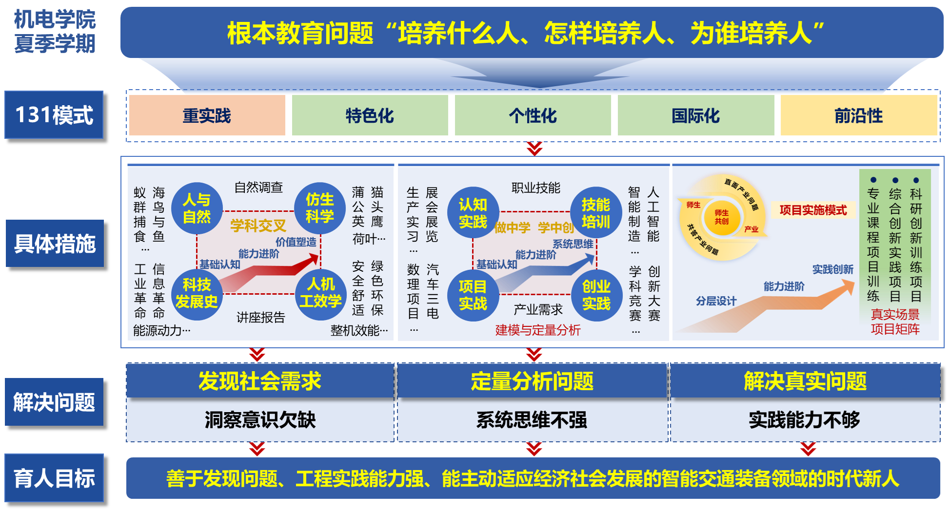 beats365紧扣“培养什么人、怎样培养人、为谁培养人”这一教育根本问题,面向制造强国战略与重庆市“33618”现代制造业产业集群需求,全面推行“三学期制”教学改革,构建了以“重实践、特色化、个性化、国际化、前沿性”(一重三化一性)为特色的夏季学期“131”育人体系,设计并实施了涵盖洞察社会需求、发现与分析问题、解决真实问题的系列化教学活动,旨在培养工程实践能力强、善于提出问题与解决问题、能主动适应经济社会发展的智能交通装备领域时代新人。