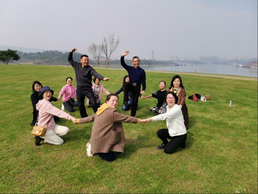 随后漫步来到广阔清丽的草坪,草坪上小草嫩绿干净,淡蓝的天空中漂浮着白云,放眼望去,明亮的美景尽收眼底。教师们时而在草坪上疾驰、时而手拉手围成圈,五花八门的游戏活动让老师们流连忘返,沉浸在一片欢乐之中。