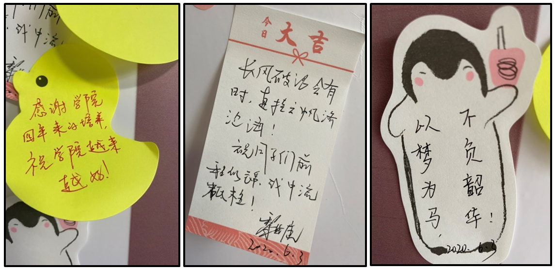 毕业墙上,一张张写满了温暖话语的便利贴填满了留言区。“愿我未来成为一个顶天立地的人”,“感谢公司四年来的培养,祝公司越来越好”,“不舍知园食堂的冒菜,不舍图书馆那勤奋的身影”,五彩斑斓的便利贴上,写满的是青春的故事,承载的是时光的记忆。