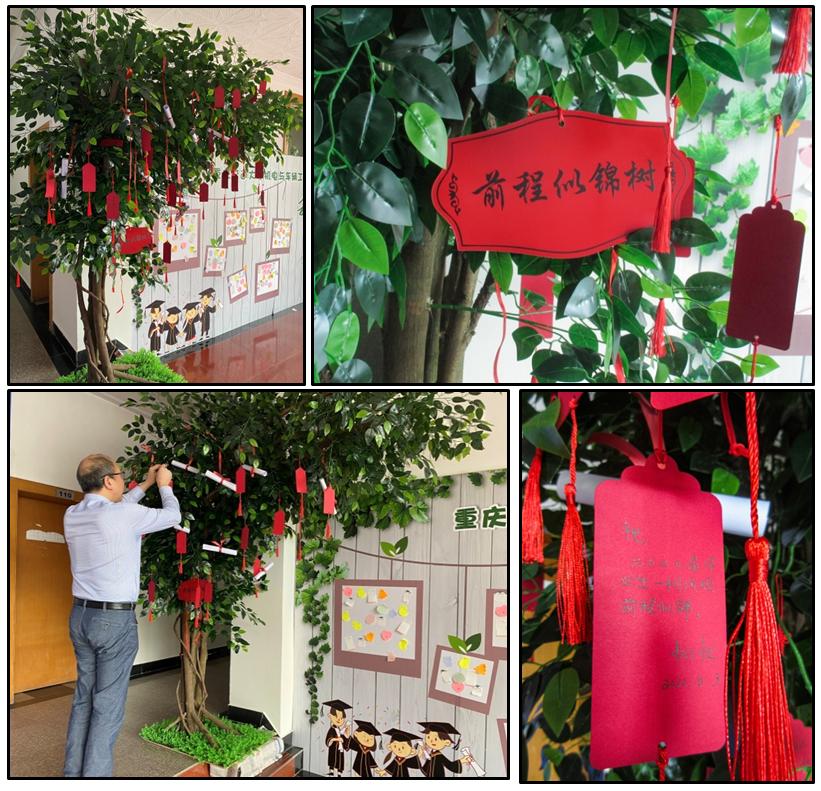 毕业墙边,一棵“前程似锦”树,寄予了公司对毕业学子们的殷切祝福;枝上的 “宏图大展”签,寓意对毕业学子坚守初心,实现远大抱负的期盼。“祝2020届毕业生前程似锦,一帆风顺”,公司党委书记杨秋挂上了对毕业生的祝福; “路漫漫,情依依”,毕业学子表达着对公司的情感与不舍。公司的领导、老师,毕业学子们纷纷写上了寄语和愿望,将承载着祝福和梦想的书签点缀在茂盛的大树上,唯愿2020届学子们前途无量,前程美好。