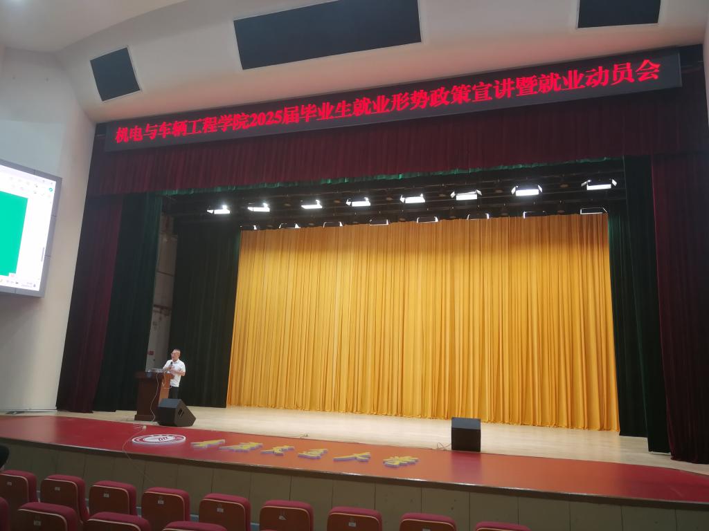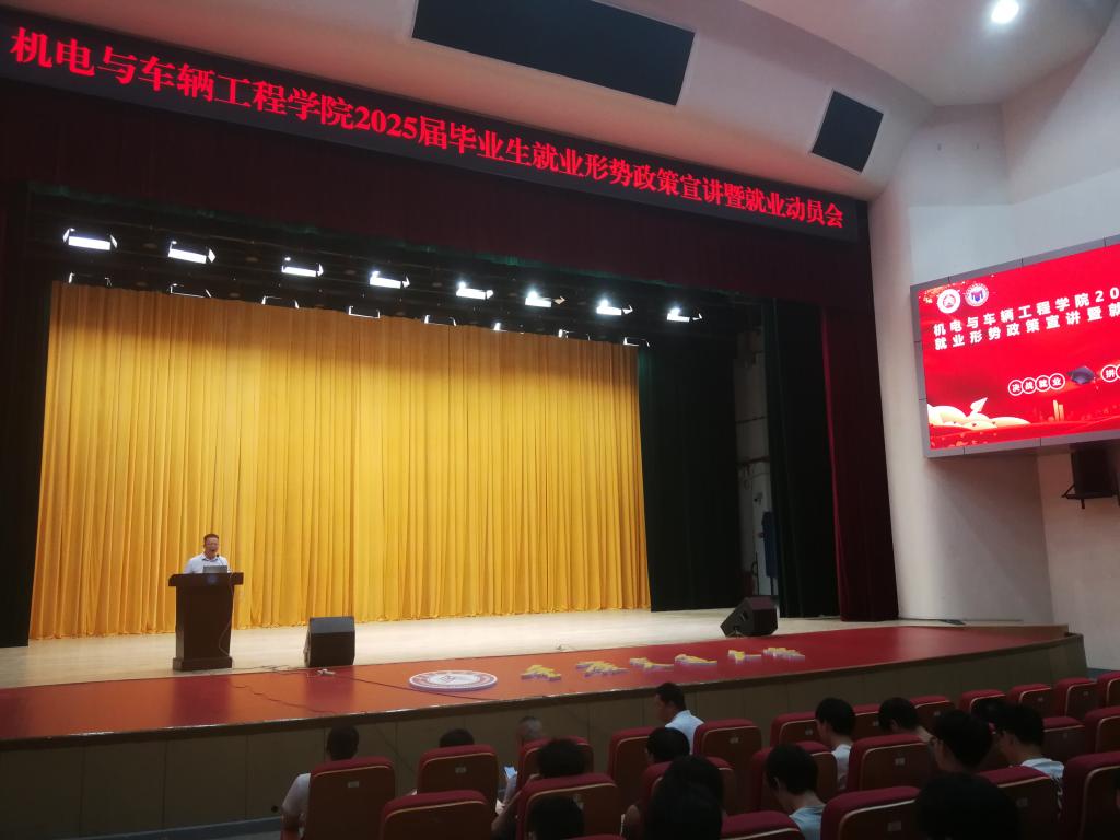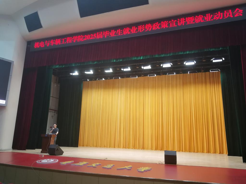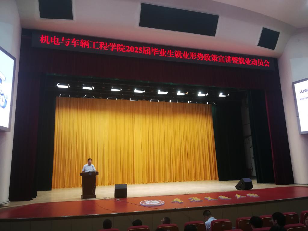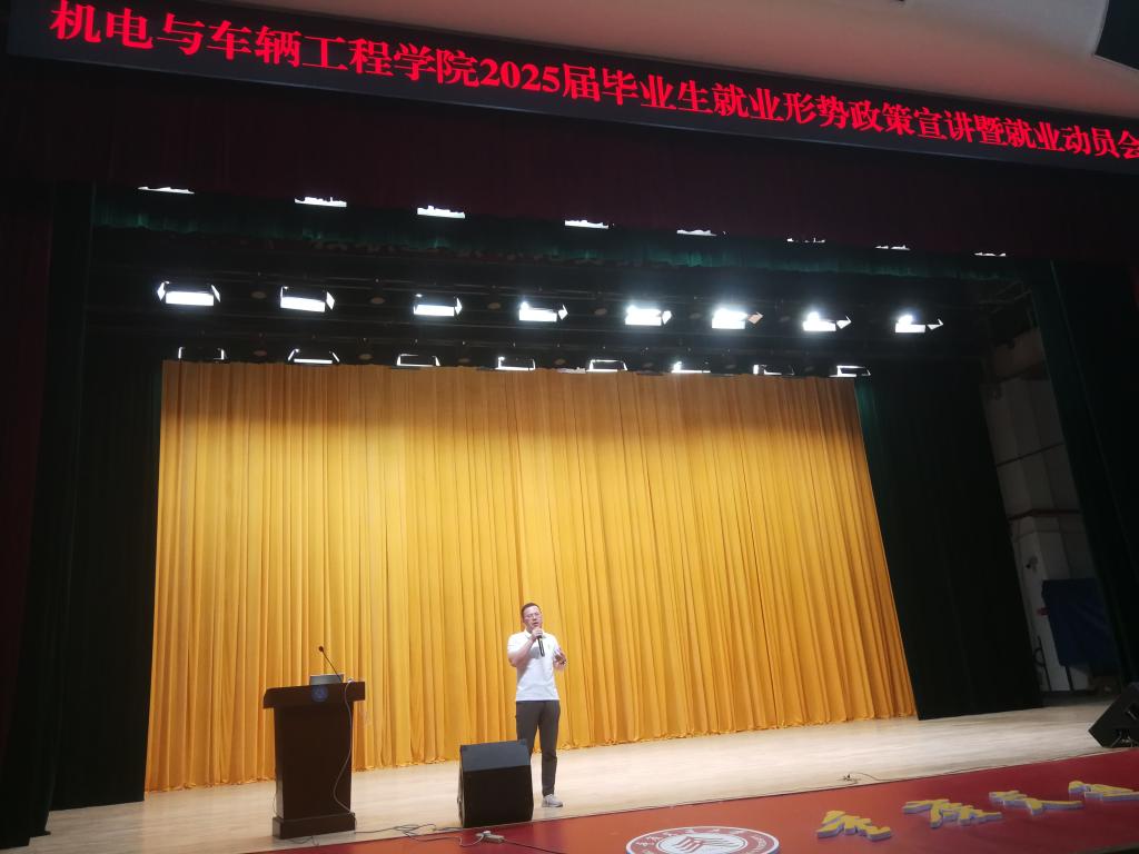 活动现场座无虚席,气氛热烈而庄重。公司经理赵树恩教授首先上台,为与会人员带来了详尽的就业形势与政策分析。他结合当前国内外经济形势,深入剖析了机电与车辆工程领域的就业前景,为毕业生们提供了宝贵的行业洞察和就业建议。赵经理的发言既高屋建瓴又贴近实际,赢得了在场师生的阵阵掌声。