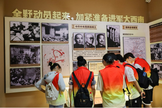 展览中,一张红底金字的照片吸引了全员驻足观看,那是进军西南第一阶段“全野动员起来,加紧准备进军大西南”战斗经过要图,指导老师苏婧说,三大战役后,国民党军队主力被消灭殆尽,人民解放军为解放西南制定了大迂回大包围的作战方针。正是由于邓、刘、贺诸首长的正确指挥,才能在短短的不足一个月的时间内进军两千多里,迅速解放了重庆。