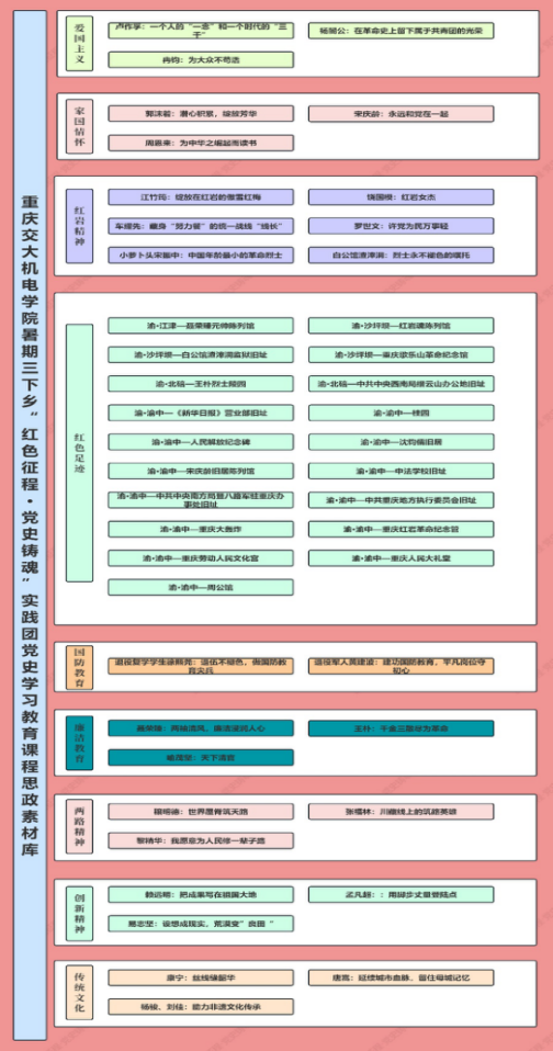 beats365官方网站beats365暑期三下乡“红色征程·党史铸魂”实践团将思政小课堂和社会大课堂紧密结合,挖掘党史学习实践要素,创新思政课实践教学,收集整理了重庆百年党史重要精神,推出了“红色征程·党史铸魂”课程思政素材库。素材库包含了爱国主义、家国情怀、红岩精神、红色足迹、国防教育、廉洁教育、两路精神、创新精神、传统文化共九个专栏,致力于推动青年员工学党史、强信念、跟党走,讲述红色故事,激发青春使命,切实推动“3+5+X”(三全育人+五育并举+多措并行构建一体化育人体系)课程思政落地生效,深度融合助推“大思政课”建设。