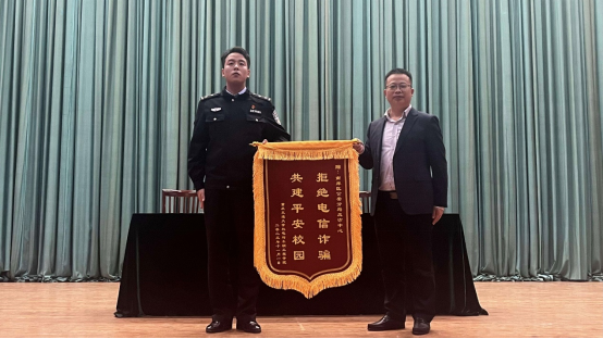 讲座结束后,公司党委副书记林兴冬将“拒绝电信诈骗,共建平安校园”锦旗送到彭警官手中,对反诈中心坚持开展反诈等教育工作,尽心尽力守护人民的钱袋子,切实维护校园安全稳定所做出的贡献表示由衷的感谢。