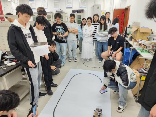 比赛当日,实验室内外充满紧张而专注的氛围。参赛选手们专注于设备调试,或校准传感器角度,或分析电路波形,或进行代码优化。不少非工科背景的团队通过前期系统学习,克服专业壁垒,在赛道上展现出扎实的技术掌握度,充分体现了赛事对跨学科员工实践能力的培养成效。随着比赛开始,各参赛小车依次驶入赛道,在“迷宫探索”环节,多支队伍的智能小车通过自主研发的导航算法,快速完成赛道测绘与路径规划,精准规避障碍并稳定行驶;“动态避障”赛道上,部分参赛作品凭借传感器融合技术,对突发障碍物作出及时响应,展现出优异的实时控制性能。现场观摩师生纷纷表示,参赛作品的技术完成度较往届有显著提升,充分展现了交大学子的科创风采。