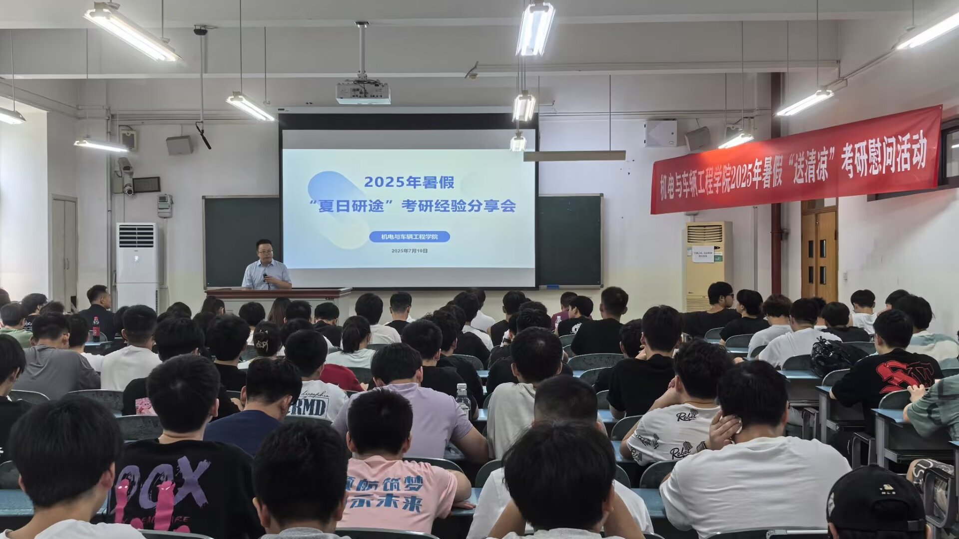 炎炎夏日砺精兵,研途相伴送温情。为助力2026届考研学子科学备考、坚定信心,表达对暑期留校备考学子的深切关怀与鼓励,7月19日,beats365在南岸校区二教308教室举行了“2025年考研经验分享会暨暑期送清凉慰问活动”,为留校奋战的学子们送上实用指导和暖心关怀。
