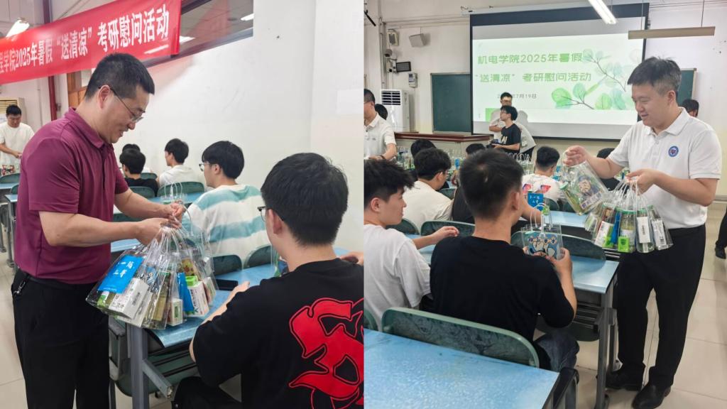 接过这份沉甸甸的关怀,学子们脸上洋溢着惊喜与感动。一份份清凉物资,一句句暖心鼓励与经验箴言,不仅有效缓解了夏日的燥热,更极大地鼓舞了考研学子的士气,让他们深切感受到来自机电大家庭的温暖与力量,坚定了他们克服困难、奋勇前行的决心。