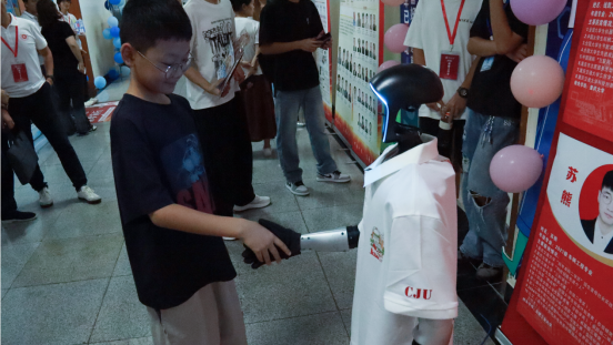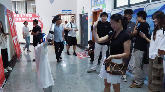 在迎新科技展示区域里,一只轮足式小狗灵活地跑来跑去,人形机器人G1也能精准地按照指令行动——新生们只需发出语音指令,就能和机器人展开实时互动。在这一过程中,大家能亲身领略机械结构设计与智能算法相互配合、共同运作的奇妙,真切触摸到“机电力量”所蕴含的科技精髓,让科技创新的种子在心底悄然种下。除此之外,公司还精心布置了学科竞赛展板和升学光荣榜,上面全面呈现了2024 - 2025学年员工们斩获的国家级竞赛奖项,以及2025届毕业生的优异升学成果,以此为新生树立起学习的标杆。
