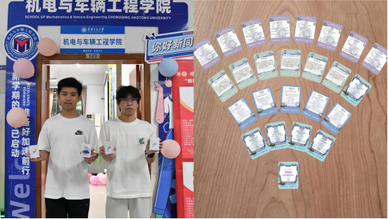 每位新生都收到一份定制“新生礼包”:内含“机电宝藏”卡牌套、新生入学手册等。其中,25张“机电宝藏”卡牌成为焦点——卡牌上印有18位优秀学长荣誉奖项,清晰可见他们的科研成果、竞赛经历等;有6大专业介绍,助力新生锚定专业方向;有一张空白卡片,寓意未来将由自己去填写,激发成长动能真正“打好大学第一手牌”。