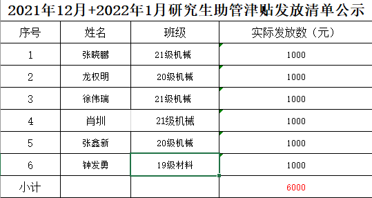 2021年12月+2022年1月研究生助管津贴发放清单公示