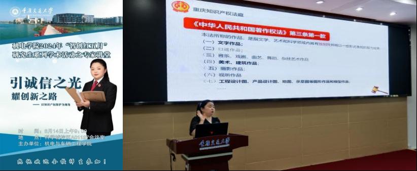 在专家讲堂阶段,论坛特邀了重庆市第一中级人民法院三级高级法官张琰老师作专题报告:“引诚信之光 耀创新之路——以知识产权保护为视角”。她以一份份民事判决书的详实案例,解读《中华人民共和国民法典》《中华人民共和国著作权法》《中华人民共和国专利法》及其《专利法实施细则》《专利审查指南》《规范申请专利行为的规定》《科研失信行为调查处理规则》等法律条款,并分析了作品的“独”与“创”等内涵外延,为师生带来一场关于学术诚信价值、法律法规适用、典型案例分析的精彩报告。