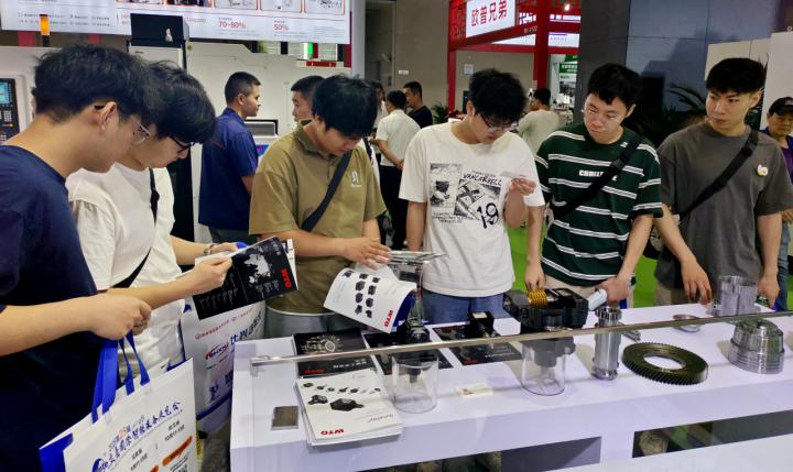 展会深度契合重庆“33618”现代制造业集群体系及“416”科技创新布局,重点围绕新能源汽车、航空航天、高端装备等重庆及西部地区核心产业,通过展览展示、技术交流、供需对接等多维度,推动西部制造业向高端化、智能化、绿色化迈进。在工业自动化与机器人展区,研究生们近距离观摩了六轴协作机器人高精度装配演示和激光切割机的自适应加工系统。德上精密机床展出的双主轴双刀塔双Y轴+B轴走心机床;力劲集团推出的新能源汽车一体化结构件成型解决方案,展现了高端装备在复杂加工场景中的应用突破。北京精雕的“大五轴”高速加工中心JDMR600,凭借其高效加工能力,成为研究生们关注的焦点。在“数字化转型”展区则通过场景化呈现智能工厂解决方案,包括迅拓自动化AGV无人仓储系统和尔必地高精度码垛机器人,重构了生产物流效率。新能源汽车与航空航天应用也是展会一大亮点,聚焦重庆产业特色,展会展示了新能源汽车三电系统的全链条加工方案,以及航空航天领域叶盘、精密齿轮等关键零部件的智能加工技术。参与活动的2024级机械工程研究生余梦旗表示:“展会展示的智能仓储解决方案和AI图像识别传感器,让我对课堂学习的控制算法有了更直观的理解。与广数机器人工程师的交流,让我意识到跨学科融合是未来技术突破的关键。”