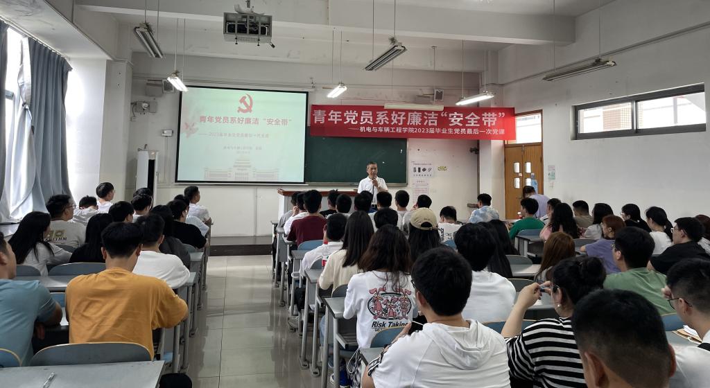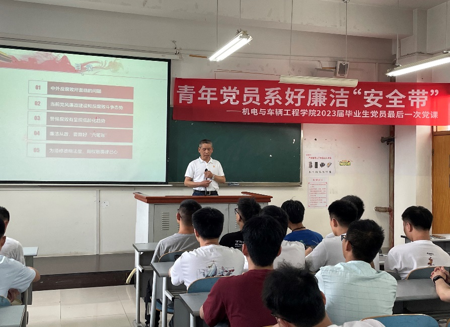 为了教育引导广大毕业生党员树立廉洁自律意识,提前接种“防腐疫苗”,筑牢拒腐防变思想道德防线的一张“金色名片”,在今后的工作学习中能够更好地发挥先锋模范作用,2023年6月1日下午,在南岸校区20603教室,机电与车辆工程公司党委组织毕业生党员开展了以青年党员系好廉洁“安全带”为主题的党课教育。本次党课由公司纪委张波书记主讲,本科及研究生全体毕业生党员参加了最后一次党课。