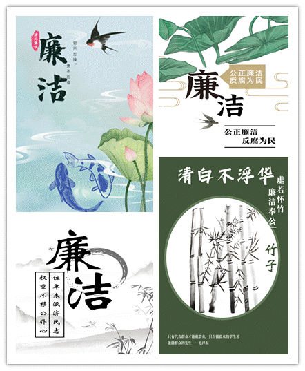 周良娟同学以竹子和莲花为主题设计了一套“公、正、廉、洁”海报,通过简洁明了的设计和文字,向人们传达了廉洁自律、清廉高尚的价值观念,引导人们坚定不移地追求高尚的品德和精神。