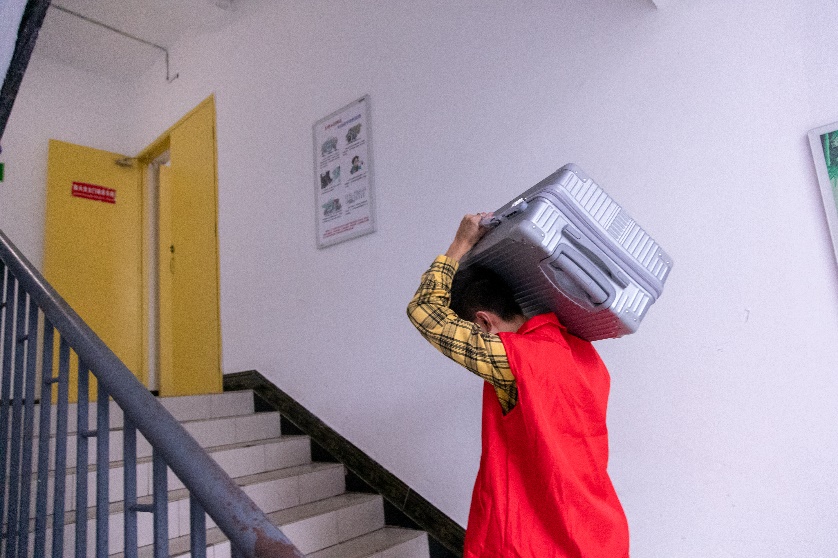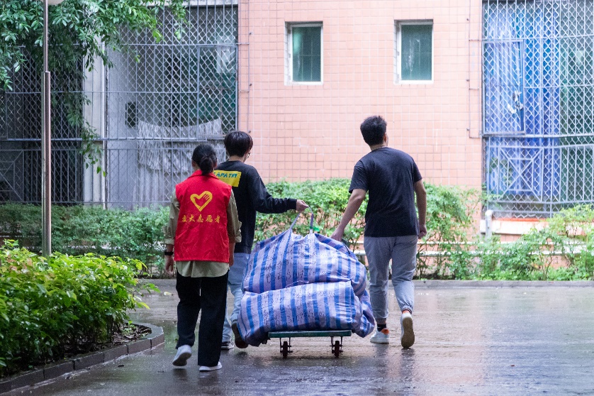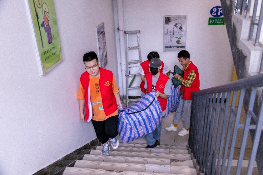 在活动过程中,志愿者们以不怕苦、不怕累的精神坚持行李搬运,用热情的微笑、耐心的言语、贴心的服务帮助2020级员工。“这位女同学,你的行李比较多,我们来帮你搭把手,帮你送到宿舍吧。”党员志愿者们及时回应同学的求助,指引他们找到宿舍楼。他们在绵绵细雨和寝室楼道中来回穿梭,校园内飘扬着一片片耀眼的党员志愿红。
