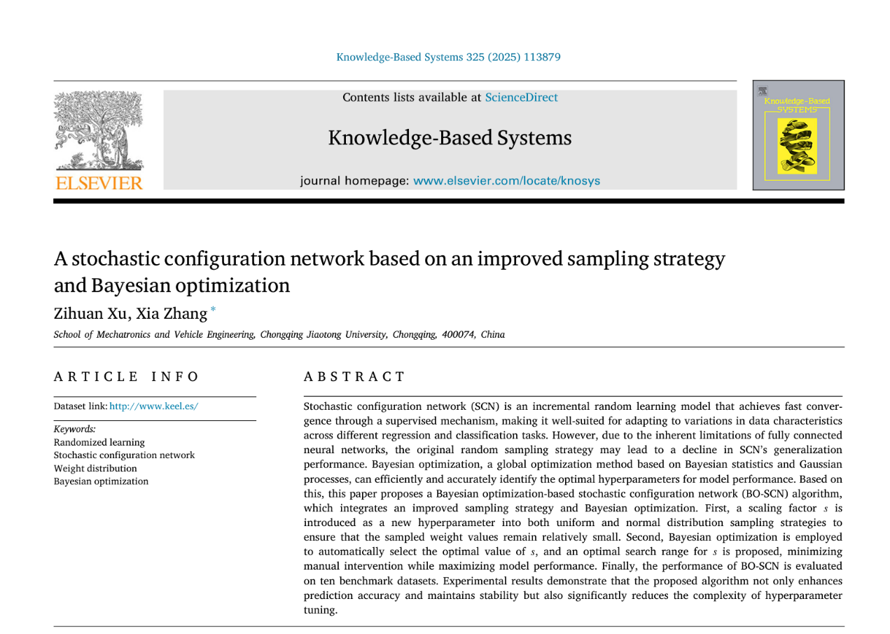 近日,公司硕士研究生徐梓桓(导师:张霞)在中科院一区Top期刊《Knowledge-Based Systems》上发表题为“A stochastic configuration network based on an improved sampling strategy and Bayesian optimization”的研究论文。论文提出的融合改进采样策略与贝叶斯优化的随机配置网络(SCN)算法,解决了传统SCN在处理复杂任务时模型性能下降和依赖人工调参的核心问题,突破了传统SCN在此类任务中的性能瓶颈。